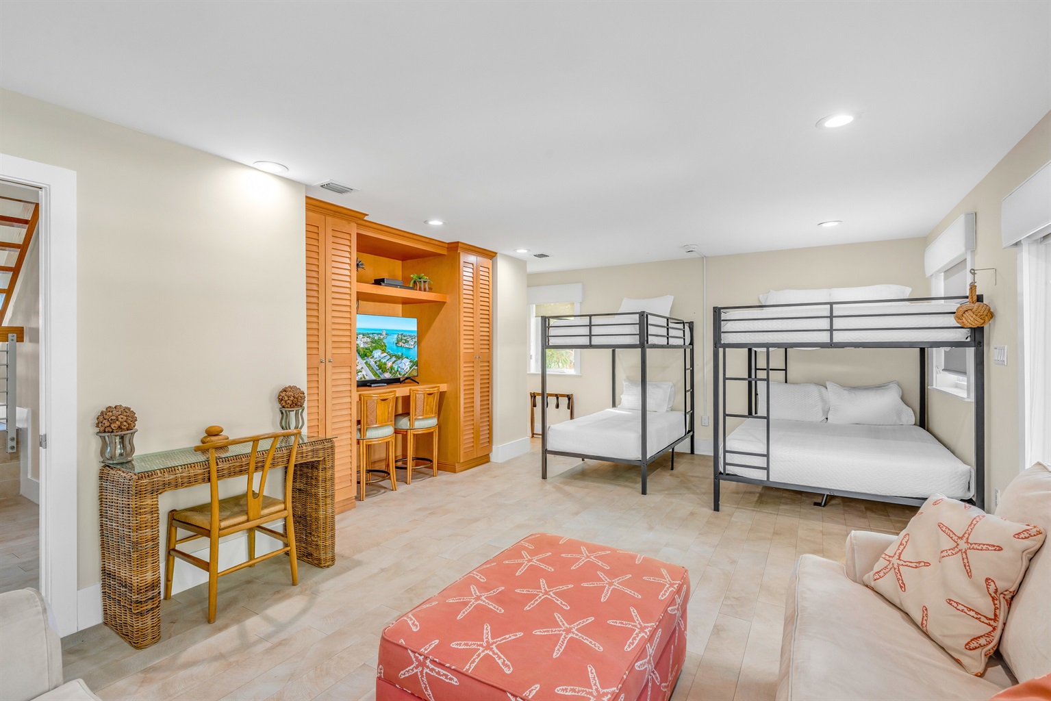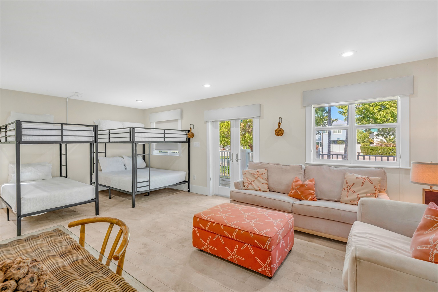 A fun, flexible sleep zone featuring twin bunk beds and queen bunk beds—great for kids, teens, or mixed groups. This room uses the bathroom off the hallway on the bottom level.