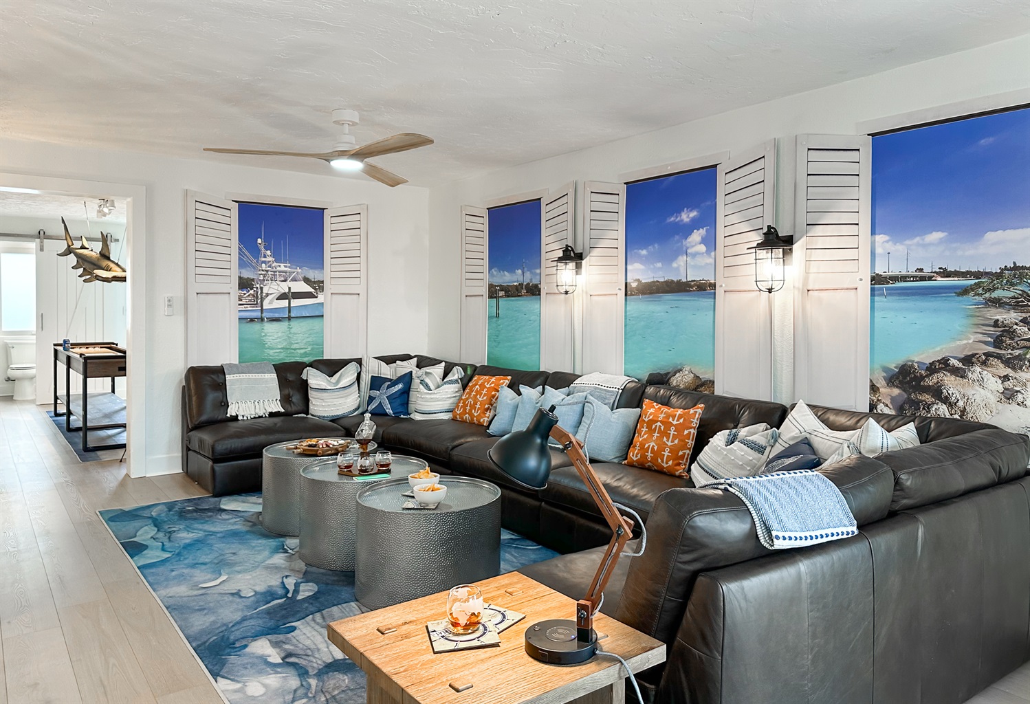 The spacious living area features panoramic water views through floor-to-ceiling windows, with a massive sectional where everyone can gather to share stories of the day's catches.